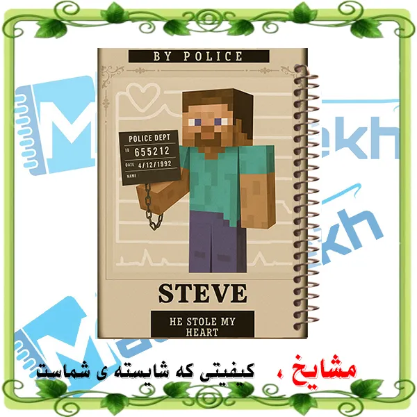 دفتر مشق ۱۰۰ برگ مشایخ با طرح هیجانانگیز ماینکرافت مدل استیو تحت تعقیب 🎮؛ دارای جلد طلقی با کیفیت، پشتجلد چوبی همرنگ، فنر مارپیچ مقاوم و کاغذ ۷۰ گرمی وزیری ✍️
