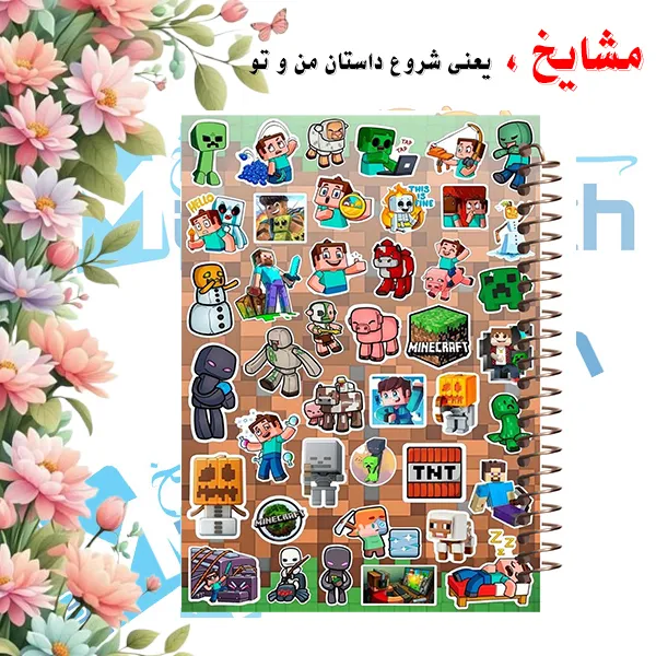 جلد این دفتر با ترکیب استیکرهای رنگارنگ از شخصیتها، آیتمها و موجودات دنیای Minecraft، مثل یه صفحهی خاطرهانگیز از بازیه که منتظر ادامهی قصهست 🧱🧍♂️🧍♀️🧨🐷
